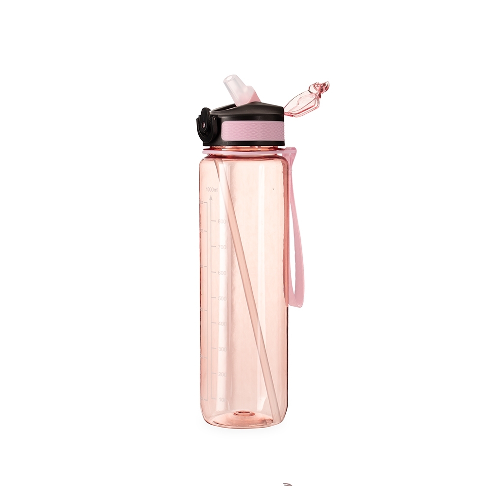 | | Squeeze plástico livre de BPA com capacidade máxima de 1,05L e marcação de volume de até 1L. Possui tampa rosqueável com bico flip, tampa protetora, botão de acionamento com trava de segurança. Acompanha canudo interno em plástico e alça para transporte em nylon.