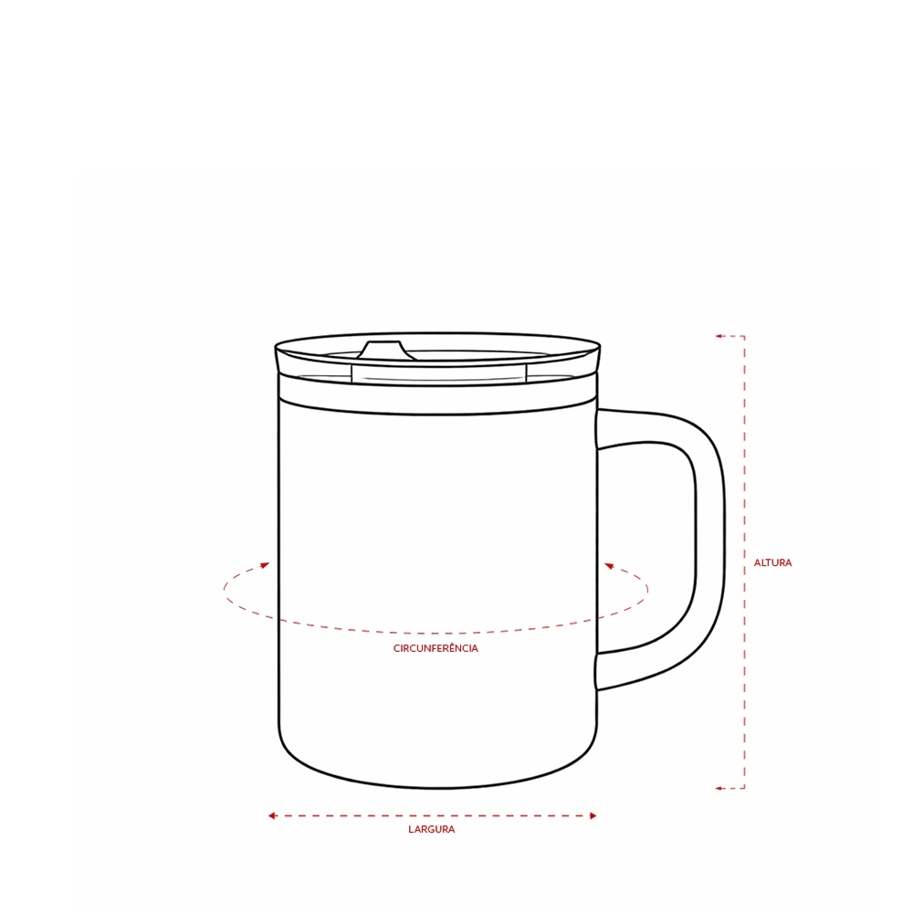 | | Caneca de parede dupla, com interior em inox 304 e revestimento externo e alça em plástico polipropileno (PP). Com capacidade máxima de 450ml, possui tampa de pressão em AS com protetor deslizante para o bocal em PP.