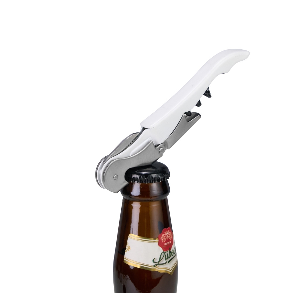 Saca-rolhas metálico de dois estágios com acabamento fosco, abridor de garrafa e lâmina para corte de rótulos.